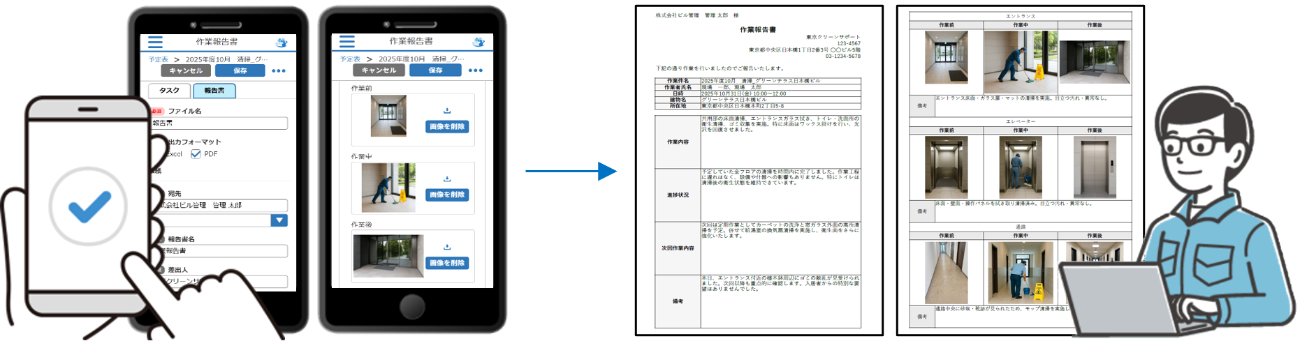あらかじめ用意されたテンプレートを使って、PCやスマホからすぐに作業報告書を作成できます。